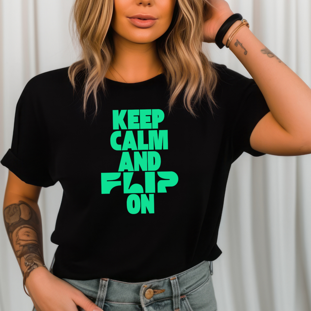 This best-selling Comfort Colors T-shirt features a witty graphic with the words "Keep Calm and Flip On".